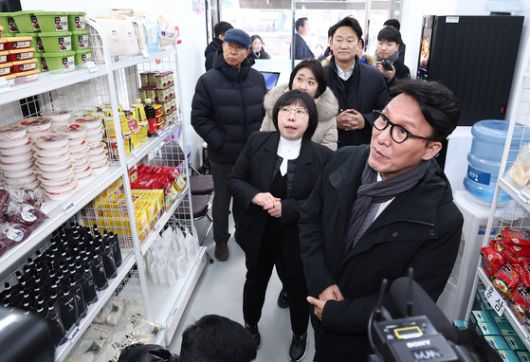 26일 서울 종로구 창신동 쪽방상담소 동행스토어 온기창고를 방문한 김민석 국무총리가 시설 운영 과정을 알아보고 있다. 뉴스1 |