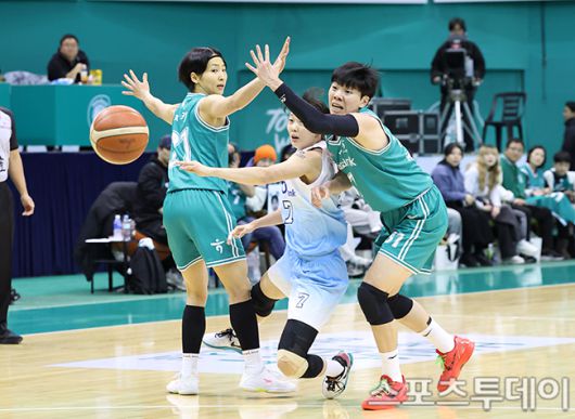 [부천(경기)=스포츠투데이 권광일 기자] BNK금융 2025-2026 여자프로농구 부천 하나은행과 인천 신한은행의 경기가 26일 경기도 부천시 부천체육관에서 열렸다. 신한은행 신지현이 수비수를 제치고 패스를 하고 있다. 2025.12.26. [스포츠투데이 권광일 기자 sports@stoo.com]
