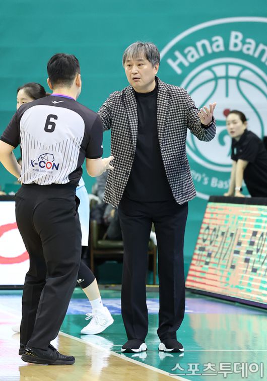 [부천(경기)=스포츠투데이 권광일 기자] BNK금융 2025-2026 여자프로농구 부천 하나은행과 인천 신한은행의 경기가 26일 경기도 부천시 부천체육관에서 열렸다. 하나은행 이상범 감독이 심판에게 항의하고 있다. 2025.12.26. [스포츠투데이 권광일 기자 sports@stoo.com]