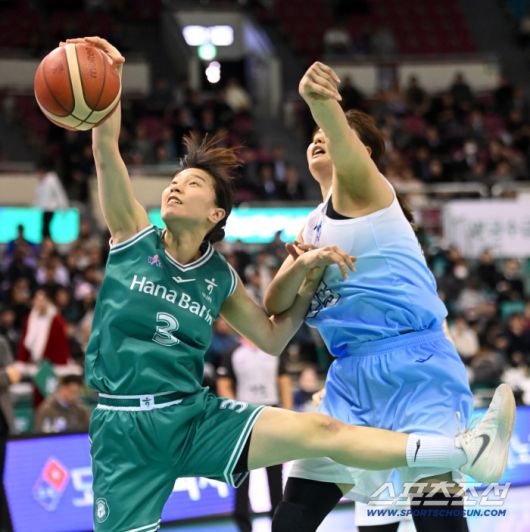 26일 부천체육관에서 열린 여자프로농구 하나은행과 신한은행의 경기. 하나은행 정현과 신한은행 미마 루이가 리바운드를 다투고 있다. 부천=허상욱 기자wook@sportschosun.com/2025.12.26/