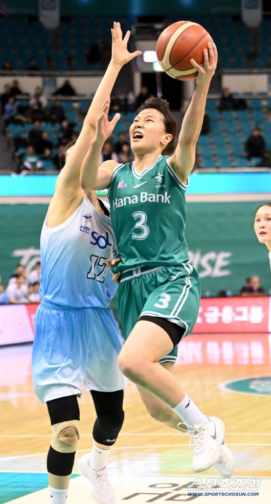 26일 부천체육관에서 열린 여자프로농구 하나은행과 신한은행의 경기. 하나은행 정현이 신한은행 이가현의 수비를 피해 레이업을 시도하고 있다. 부천=허상욱 기자wook@sportschosun.com/2025.12.26/