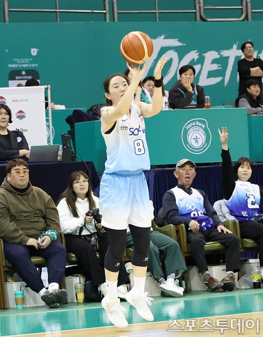 [부천(경기)=스포츠투데이 권광일 기자] BNK금융 2025-2026 여자프로농구 부천 하나은행과 인천 신한은행의 경기가 26일 경기도 부천시 부천체육관에서 열렸다. 신한은행 김지영이 3점 슛을 시도하고 있다. 2025.12.26. [스포츠투데이 권광일 기자 sports@stoo.com]