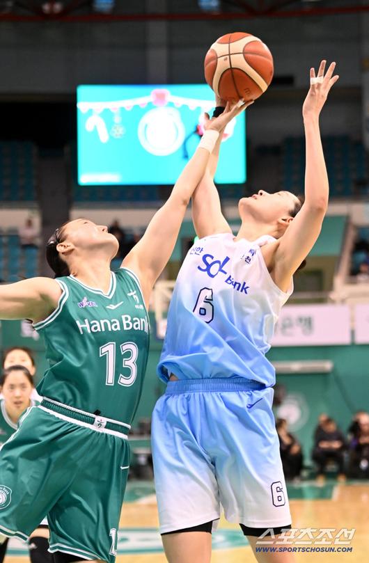 26일 부천체육관에서 열린 여자프로농구 하나은행과 신한은행의 경기. 신한은행 최이샘과 하나은행 김정은이 리바운드를 다투고 있다. 부천=허상욱 기자wook@sportschosun.com/2025.12.26/