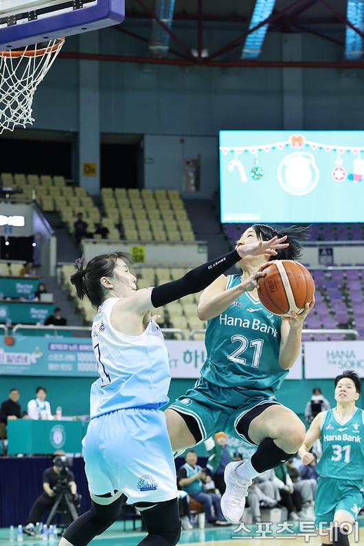 [부천(경기)=스포츠투데이 권광일 기자] BNK금융 2025-2026 여자프로농구 부천 하나은행과 인천 신한은행의 경기가 26일 경기도 부천시 부천체육관에서 열렸다. 하나은행 이이지마 사키가 슛을하고 있다. 2025.12.26. [스포츠투데이 권광일 기자 sports@stoo.com]