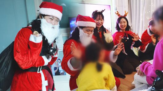 ['사랑의 몰래 산타' 봉사자 : 산타 할아버지가 오셨대. 우리 같이 불러볼까? 하나, 둘, 셋! {산타 할아버지!}]
