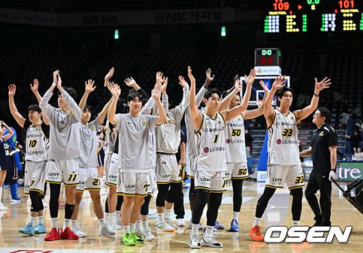 창원 LG 선수들이 2번의 연장전 끝에 109-101로 승리한 후 팬들에게 감사 인사를 하고 있다. 2025.12.26 / foto0307@osen.co.kr