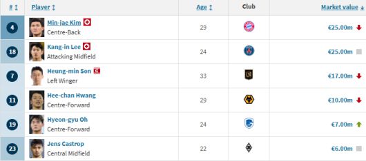 미국 메이저리그사커(MLS) LAFC로 이적한 손흥민이 1700만 유로(290억원)로 3위다. 프리미어리그 울버햄프턴 공격수 황희찬이 1000만 유로(170억원), 벨기에 헹크 공격수 오현규가 700만 유로(119억원)로 각각 4위와 5위다.