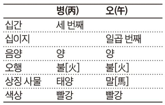 다른 방법들로는 丙午라는 글자에 대한 ‘해석학’이다. ‘2026’이란 숫자를 보고 우리는 어떤 의미를 찾을 수 없다. 그러나 ‘丙午’라는 글자를 두고는 ‘논문’ 한 편을 써도 부족할 정도로 해석에 해석을 거듭할 수 있다. 그 두 글자에는 십간·십이지·음양·오행이 다 들어가 있기 때문이다. 이것들은 점술의 도구가 아니라 동아시아에서는 세계를 해명하고 표현하려는 ‘언어’였다. 전통적으로 서양이 ‘원인→결과’, ‘물질→법칙’으로 세계를 설명했다. 반면 동아시아는 위로는 왕조의 출현에서 아래로는 한 개인의 흥망성쇠 등을 ‘기(氣)의 흐름과 변화’로 설명하려 했다. 십간·십이지·음양·오행은 그 설명을 위한 기본 문법이었다. 병오(丙午)를 도표로 표기하면 다음과 같다.
