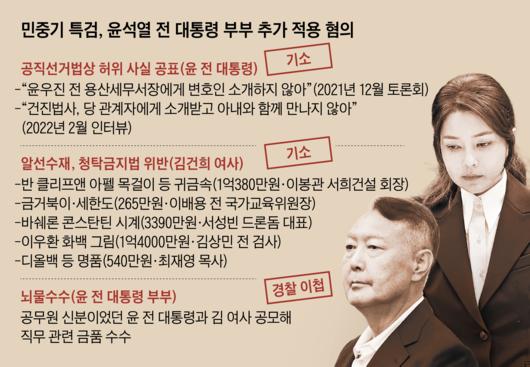 김건희 여사 관련 의혹을 수사하는 민중기 특별검사팀이 26일 윤석열 전 대통령을 공직선거법상 허위사실 공표 혐의로, 김 여사를 ‘매관매직’ 의혹과 관련한 수억원대 금품 수수 혐의로 각각 추가 기소했다. 이날까지 김건희 특검은 구속 19명 포함 총 53명을 재판에 넘기며 사실상 수사를 마무리했다. 특검 수사 기한은 오는 28일까지며, 29일 최종 수사 결과를 발표한다.