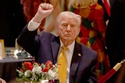 도널드 트럼프 미국 대통령이 24일(현지시간) 미국 플로리다주 팜비치 마라라고 클럽에서 열린 크리스마스이브 만찬에 참석해 주먹을 쥔 손을 들어올리고 있다. AP=연합뉴스 |