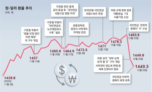26일 서울 외환시장에서 원-달러 환율은 전 거래일 대비 9.5원 내린 1440.3원으로 주간 거래를 마쳤다. 24일 33.8원 급락한 데 이어 이날도 하락하며 2거래일 동안 43.3원(2.9%)이나 하락했다. 이날 종가는 11월 4일(1437.9원) 이후 가장 낮다.