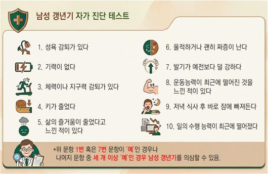 남성 갱년기는 방치해선 안 된다. 남성 호르몬이 지속적으로 줄어들면 전립선비대증, 발기부전 등 중장년 남성 질환으로 이어질 가능성이 높다. 대사질환, 심혈관계 질환, 뇌혈관 질환에 걸릴 위험도 높아진다. 배 교수는 “남성 갱년기는 노화로 인한 자연스러운 변화”라며 “적극적으로 대응하면 건강한 노년을 보낼 수 있다”고 강조했다.