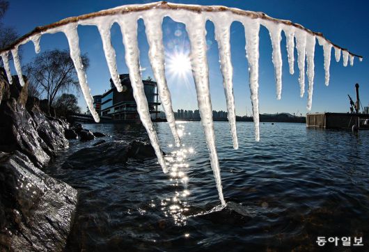 전국 대부분 지역에 한파특보가 발효된 26일 서울 광진구 뚝섬한강공원 나뭇가지에 고드름이 맺혀 있다. 이날 오전 체감온도는 서울 영하 17.6도, 강원 고성군과 인제군에 걸친 향로봉 영하 35.3도로 올겨울 최강 한파를 기록했다. 한파는 27일까지 이어져 이날 아침 최저기온은 영하 15도∼영하 3도로 평년보다 2∼7도 낮을 것으로 전망된다. 양회성 기자 yohan@donga.com |
