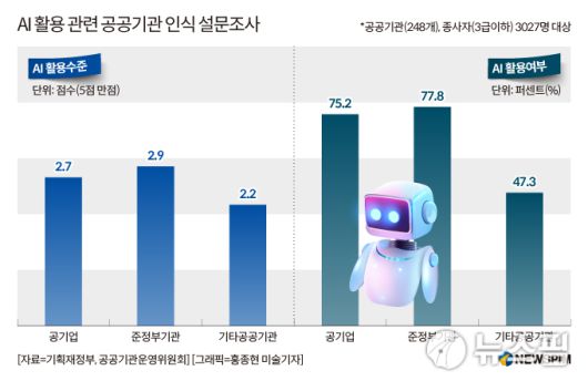 AI 활용 수준을 점수로 평가한 인식 조사에서도 비슷한 흐름이 나타났다. 공공기관 종사자 3027명을 대상으로 한 조사에서 공기업의 AI 활용 수준 평균은 2.74점, 준정부기관은 2.85점으로 집계됐다. 기타공공기관은 2.17점에 머물렀다.