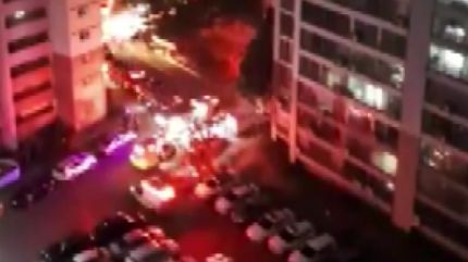 창문에서 연기가 치솟고, 소방차 경광등이 쉴새 없이 번쩍입니다.