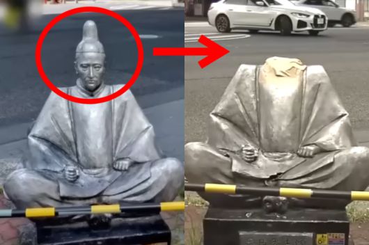 일본 아이치현 나고야시 니시구의 엔도지 상점가 입구에 세워진 도요토미 히데요시 동상이 목이 부러진 상태로 발견됐다. 사진은 목이 부러지기 전 동상의 모습(왼쪽)과 목이 부러진 후 동상의 모습. 나고야TV 보도화면 캡처 |