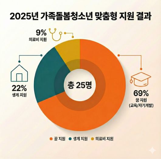 특히 올해 지원은 단순히 생계를 유지하는 것을 넘어, 청소년들이 자신의 미래를 설계할 수 있도록 돕는 '꿈 지원(교육비, 자기계발비 등)' 항목이 전체의 69%를 차지하며 큰 호응을 얻었다. 이어 생계비(22%), 의료비(9%) 지원이 병행되어 가정의 경제적 부담을 덜어주었다.