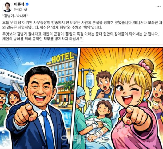 이 대표는 26일 자신의 페이스북에 “오늘 우리 당 이기인 사무총장이 방송에서 한 비유는 사안의 본질을 정확히 짚었다”면서 “매니저나 보좌진 과의 갈등은 지엽적이다. 핵심은 ‘실제 행위’와 주체의 ‘책임’”이라면서 김병기, 박나래 이미지를 올리며 직격했다.