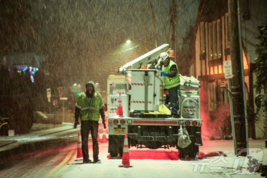 지난 26일(현지시간) 뉴욕주 피어몬트(Piermont)에서 공공시설 서비스(Utility) 직원들이 쏟아지는 눈발을 뚫고 긴급 복구 작업을 진행하고 있다. 이날 뉴욕을 포함한 트라이스테이트(Tri-State) 지역에는 최대 12인치(약 30cm)의 기록적인 폭설이 예고되면서 비상사태가 선포되었으며, 기상 당국은 금요일 26일 저녁부터 토요일 27일 오전까지를 이번 폭풍의 최대 고비로 전망했다. /ⓒ AFP=뉴스1 |