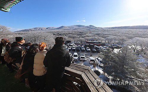 (제주=연합뉴스) 변지철 기자 = 맑은 날씨를 보인 27일 한라산 해발 1천100m에 있는 제주의 대표적인 설경 명소인 '1100고지' 휴게소 일대에 많은 관광객이 찾아 설경을 즐기고 있다. 2025.12.27