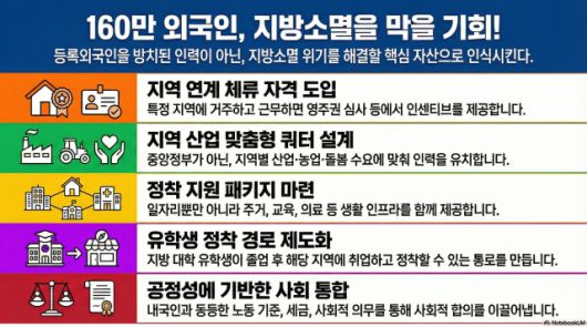 이 지점에서 이민 정책은 결정적 수단이 될 수 있다. 지금처럼 외국인 노동력이 수도권 산업 현장으로 자연 유입되는 구조를 그대로 두면 수도권 과밀 비용은 커지고, 지방 공동화는 가속화된다. 반대로 지역 정착을 전제로 설계된 이민 정책은 지방의 생산 기반을 복원하고 국가 경쟁력을 보완하는 전략 자산이 될 수 있다.
