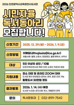 (인천=국제뉴스) 이병훈 기자 = 인천시교육청연수도서관은 시민의 자발적인 독서활동을 지원하고 독서의 생활화를 확산하기 위해 '2026년 시민자율독서동아리'를 모집한다고 밝혔다.
