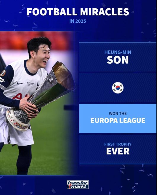 독일의 축구 이적 및 통계 전문 매체 '트랜스퍼마르크트'는 '2025년 축구계 8대 기적'을 선정하면서 손흥민의 유로파리그 우승을 포함했습니다.