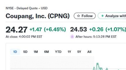 뉴욕증시에서 쿠팡 주가가 6.45% 상승했습니다.
