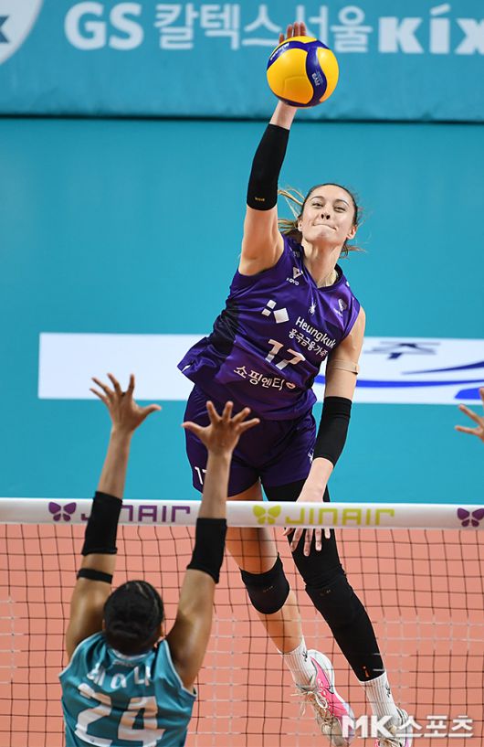 27일 서울 장충체육관에서 프로배구 2025-2026 V리그 여자부 GS칼텍스와 흥국생명의 경기가 열렸다. 흥국생명 레베카가 공격하고 있다. 사진=천정환 기자 장충(서울)=천정환 MK스포츠 기자 [ⓒ MK스포츠, 무단전재 및 재배포 금지]