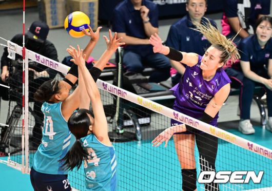 [OSEN=장충, 지형준 기자] 27일 오후 서울 장충체육관에서 프로배구 진에어 2025~26 V리그 GS칼텍스와 흥국생명의 경기가 열렸다. GS칼텍스는 7승 9패(승점23, 4위), 흥국생명은 9승 8패(승점28, 3위)를 기록중이다. 1세트 흥국생명 레베카가 GS칼텍스 블로킹을 피해 강타를 날리고 있다. 2025.12.27 /jpnews@osen.co.kr