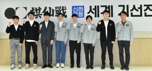 27일 제1회 신한은행 세계 기선전 16강전에서 승리를 거둔 8명의 선수가 대진 추첨을 통해 8강 상대를 결정한 뒤 기념 촬영을 하고 있다. 왼쪽부터 신민준 9단, 당이페이 9단, 신진서 9단, 왕싱하오 9단, 김명훈 9단, 시바노 도라마루 9단, 박정환 9단, 이치리키 료 9단. 한국기원 |