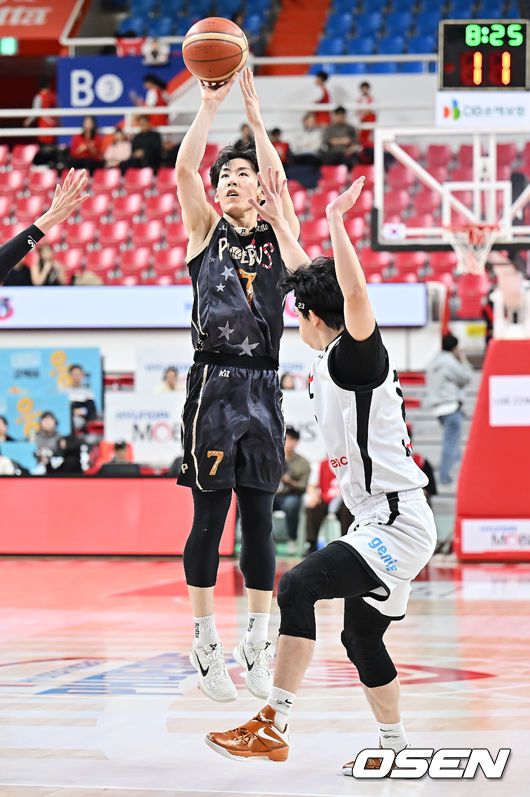 [OSEN=울산, 이석우 기자] 27일 울산 동천체육관에서 2025-2026 LG전자 프로농구 울산 현대모비스와 수원 KT의 경기가 열렸다. 울산 현대모비스는 순위 상승을 위한 결정적 전환점을 모색하고 있고, 3연패에 빠진 수원 KT 역시 반등이 절실한 상황에서 두 팀이 맞대결한다. 울산 현대모비스 서명진이 3점슛을 시도하고 있다. 2025.12.27 / foto0307@osen.co.kr