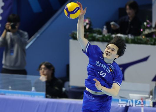 [인천=뉴시스] 황준선 기자 = 19일 인천계양체육관에서 열린 진에어 2025~2026 V-리그 남자부 한국전력 빅스톰과 대한항공 점보스의 경기, 한국전력 김정호가 서브하고 있다. 2025.12.19. hwang@newsis.com |