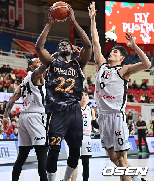 울산 현대모비스 존 이그부누가 수원 KT 데릭 윌리엄스, 하윤기의 마크를 피해 골밑슛을 시도하고 있다. 2025.12.27 / foto0307@osen.co.kr