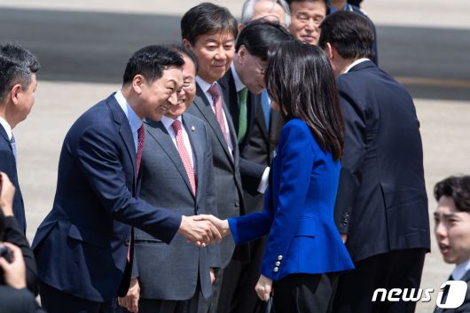 지난 2023년 5월 19일 윤석열 대통령과 함께 일본 방문길에 오른 김건희 여사가 경기 성남시 서울공항에서 환송나온 김기현 국민의힘 대표와 인사하고 있다. 2023.5.19/뉴스1 ⓒ News1 유승관 기자 |