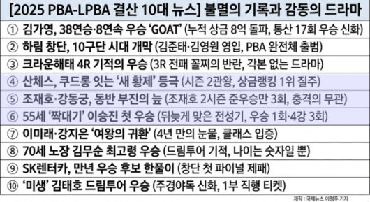 [이정주 기자] (고양=국제뉴스) 이정주 기자 = 다사다난했던 2025년, 프로당구 PBA-LPBA는 그 어느 때보다 뜨거웠다. '여제'는 여자 프로의 한계를 뛰어 넘는 대기록을 작성했고, 막내 구단의 합류로 리그는 완전체가 되었다. 벼랑 끝에 몰렸던 팀은 기적 같은 반전 드라마를 썼다. 본지는 '2025년 PBA-LPBA 10대 뉴스'를 선정, 상·중·하 3편에 걸쳐 한 해를 되돌아본다. PBA 10대 뉴스 (상)은 리그 역사를 새로 쓴 '기록과 변화'다.