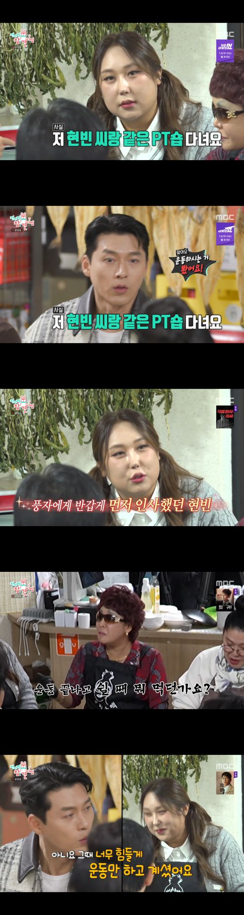 이날 방송에서는 이영자가 정성껏 준비한 제철 한상차림을 맛보며 자연스럽게 토크가 이어졌다. 이 자리에서 풍자는 현빈과의 뜻밖의 인연을 공개해 모두를 놀라게 했다. 풍자는 “사실 같은 PT숍을 다녔다”고 고백했고, 현빈 역시 “운동하는 걸 본 적이 있다”며 담담하게 맞장구를 쳤다.