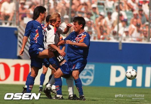 독일과의 조별리그 3차전 역시 인상 깊었다. 전반에만 3골을 내주며 무너지는 듯했지만 후반 황선홍과 홍명보의 연속 골로 맹렬한 추격을 펼치며 디펜딩 챔피언을 몰아붙였다. 당시 멀티골을 기록한 위르겐 클린스만은 “경기 시간이 5분만 더 있었더라면 정말 우리가 졌을지도 모른다”고 말할 정도로 후반 45분은 한국이 주도한 흐름이었다.