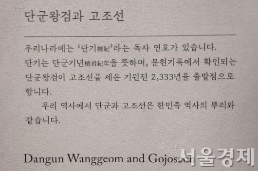 국립중앙박물관 상설전시관에는 ‘고조선실’이 있다. 입구에 ‘단군왕검과 고조선’이라는 제목으로 “우리나라에는 ‘단기’라는 독자 연호가 있습니다. 단기는 단군기년을 뜻하며 문헌기록에서 확인되는 단군왕검이 고조선을 세운 기원전 2333년을 출발점으로 합니다. 우리 역사에서 단군과 고조선은 한민족 역사의 뿌리와 같습니다”라는 설명이 붙어있다.