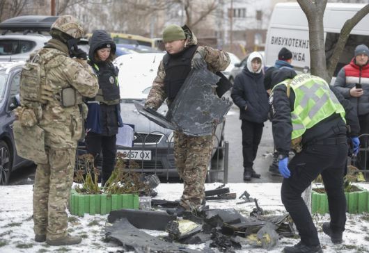 러시아가 우크라이나 수도 키이우에 대규모 공습을 감행한 가운데 27일(현지시간) 전문가들이 러시아 자폭 드론 잔해를 조사하고 있다. EPA 연합 |