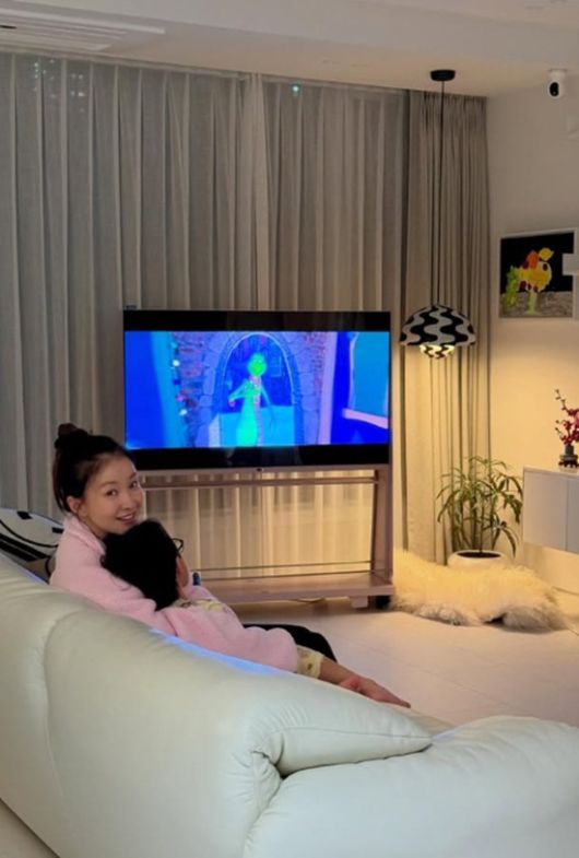 공개된 사진에는 이시영이 아들과 함께 거실에서 TV를 보며 여유로운 시간을 보내고 있는 모습이 담겨 있다.