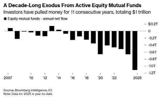 블룸버그 인텔리전스가 27일(현지시간) 미국투자회사협회(ICI) 자료를 분석한 결과, 올해 액티브 주식형 뮤추얼 펀드에서 약 1조달러(약 1445조원)가 빠져나갔다. 11년 연속 순유출이면서 가장 큰 유출 규모다.