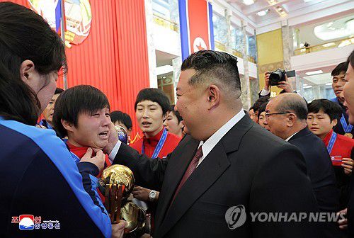 김 위원장은 특히 국제축구연맹(FIFA) 17세 이하(U-17) 여자 월드컵에서 1위를 차지한 여자축구팀 선수들과 감독을 만나 축하 인사를 건네며 크게 격려했다.