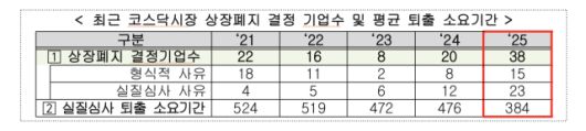 상장폐지까지 걸리는 시간도 눈에 띄게 단축됐다. 상장폐지 사유가 발생한 뒤 실질심사를 거쳐 상장폐지가 결정된 23개사의 평균 퇴출 소요 기간은 384일로, 최근 3년 평균인 489일보다 약 21%(105일) 줄었다. 과거 관리종목 지정과 개선 기간 부여가 반복되며 상장폐지가 장기화됐던 것과 달리, 올해는 회계·공시 등 핵심 요건을 충족하지 못한 기업에 대해 보다 신속한 정리가 이뤄졌다는 설명이다.