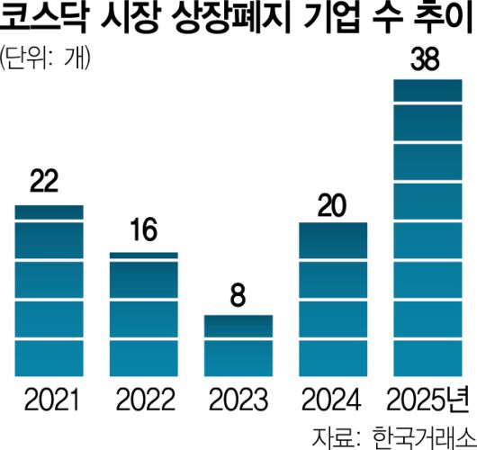 반대로 코스닥 시장은 올해 38개사에 대해 상장폐지를 결정했다. 2022~2024년 연평균 퇴출 기업 대비 2.5배 수준이다. 상장폐지 결정 기업의 평균 퇴출 소요 기간도 384일로 최근 3년 평균치(489일) 대비 21% 단축했다. 특히 올해 하반기부터 심의단계가 축소되면서 평균 퇴출기간을 261일까지 줄였다.