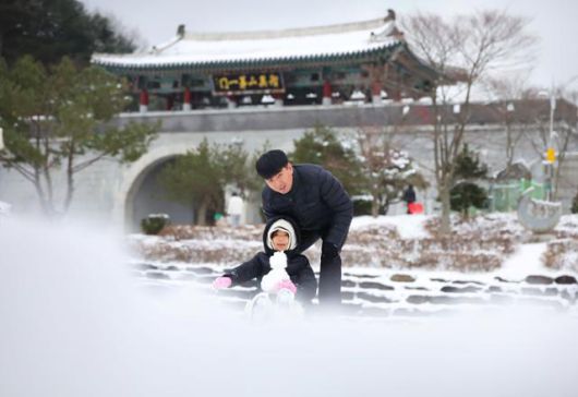 밤새 눈이 내린 14일 경남 함양군 휴천면 ‘지리산 풍경길’ 대한민국 관광도로 1호로 선정된 지리산 제1문 오도재에서 한 가족이 눈썰매를 타며 즐기운 시간을 보내고 있다. 노동연구원의 최근 연구 보고서에 따르면 지난 10년 사이 우리 국민이 가족 등과 교제활동에 들인 시간은 크게 늘었다. 뉴스1