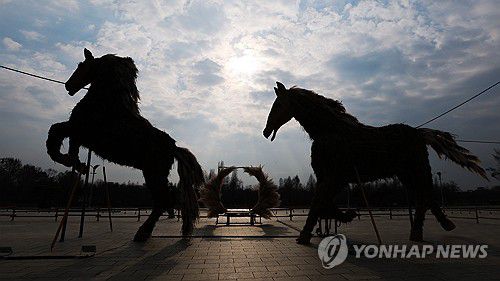(서울=연합뉴스) 서대연 기자 = 붉은 말의 해인 2026년 병오년을 앞둔 28일 서울 마포구 월드컵공원에 억새로 만든 말 '억새말 형제' 조형물이 설치돼 있다. 2025.12.28