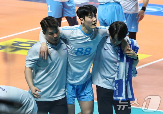 (서울=뉴스1) 김도우 기자 = 28일 서울 중구 장충체육관에서 열린 진에어 2025-26 V-리그 프로배구대회 우리카드와 대한항공의 경기, 대한항공 임재영이 부상으로 교체되고 있다. 2025.12.28/뉴스1pizza@news1.krCopyright ⓒ 뉴스1. All rights reserved. 무단 전재 및 재배포, AI학습 이용 금지.