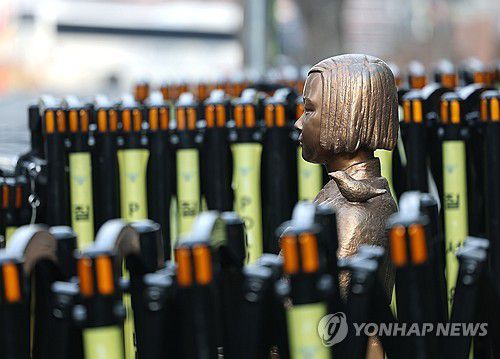 (서울=연합뉴스) 류영석 기자 = 2015년 한일 일본군 '위안부' 합의 10주년을 맞은 28일 서울 종로구 옛 일본 대사관 앞 평화의 소녀상 모습.