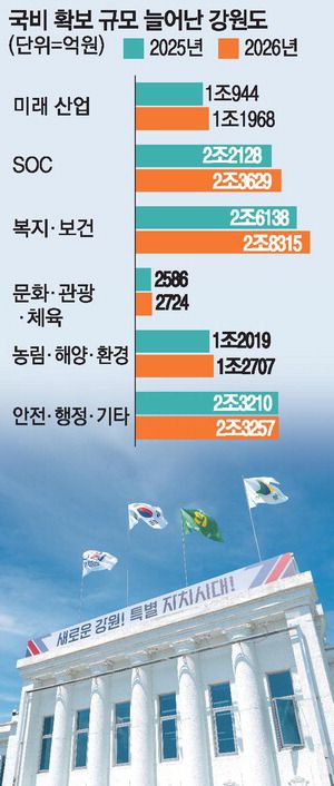 주요 분야별로는 미래산업이 1조1968억원으로 전년도(1조944억원)보다 1024억원 늘었다. SOC는 2조3628억원, 복지 분야는 2조8315억원 등을 각각 확보했다. 강원도 예산 구조가 기존 SOC·복지 중심에서 미래산업 비중을 빠르게 키우고 있다는 점이 수치로 확인된다.